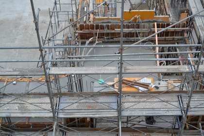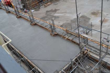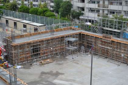 講堂の建て替え工事が大きな節目を終わったのでおしらせします。今日は、1階の壁、柱、2階部分の梁のコンクリート打ちが終わりました。先日来、鉄筋を組み、枠を作りコンクリートを流し込む準備をしてきて、今日、コンクリートを流し込みました。
