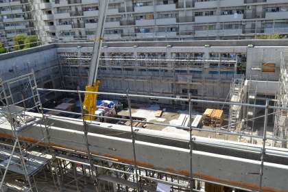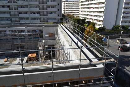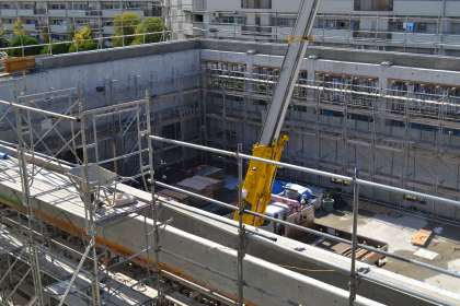 雨上がりの今日の昼、4階から工事現場を除くと、2階部分の壁が出来上がっていました。大きな窓枠を残し、コンクリートの壁がしっかりと確認できました。
