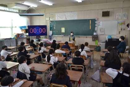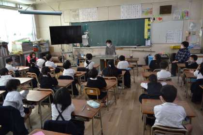 今週は読書週間でした。都島区の読み聞かせをされているサークルの方を招いてお話の会をしました。教室の明かりが消えると、いよいよお話の会のはじまりです。