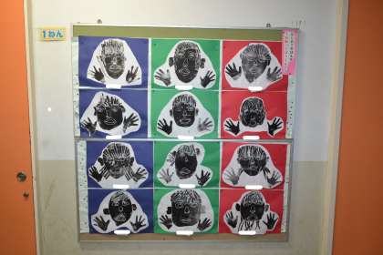 1枚目の写真が1年生の紙版画です。小学校に入って初めての版画です。画用紙を自分の顔や手の形に切って貼り合わせて制作しました。