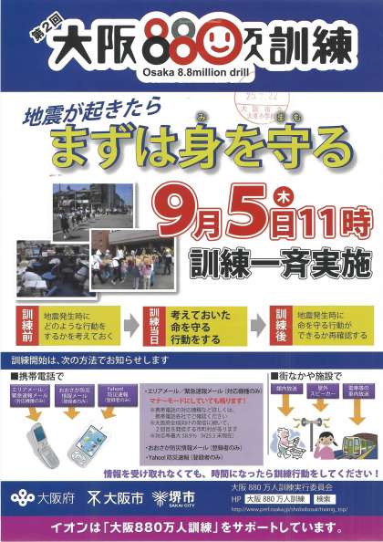 また、明日は、「大阪880万人訓練」が実施されます。大東小学校も、11時の合図で、地震の訓練、その後の、津波からの避難訓練を同時に行います。