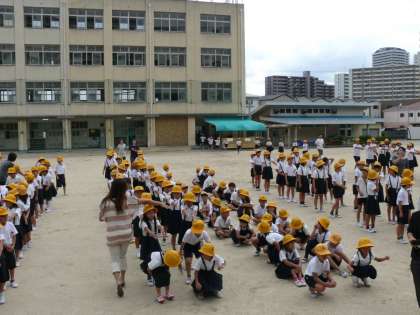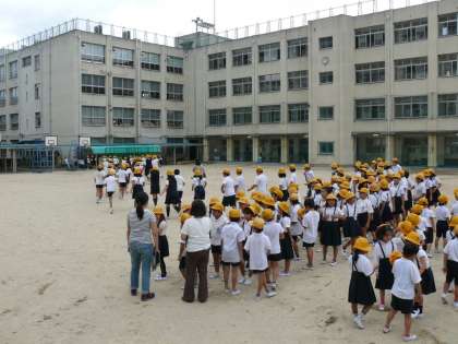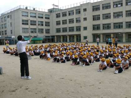 昨日の天気予報を心配していたのですが、訓練日和の中、「大阪880万人訓練」に参加する形態で本校の避難訓練を実施しました。