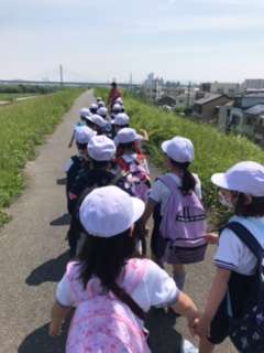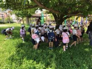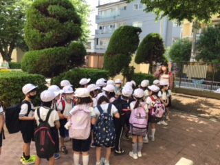 今日は1年生が遠足で城北公園に出かけました。学校を出発して歩いてる城北公園に到着しました。
