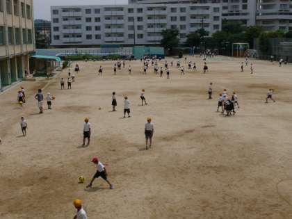最近、非常に暑い日が続いたり、雨が降ったりと、梅雨か真夏かわからない日が続いています。今日は、ムシムシしながら、「暑いな〜」とぼやく大人をよそに、子どもたちは元気いっぱいに運動場に出て遊んでいました。