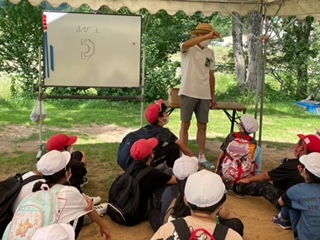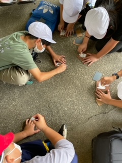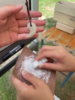 今年は勾玉づくりに挑戦します。説明を聞いてとりかかります。3枚の紙やすりを使って削っていきます。まず1枚目のやすりで削っています。