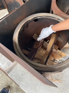 かまど係です。うまく木を重ねていきます。