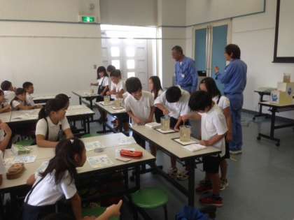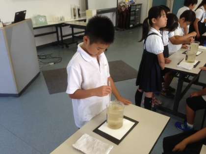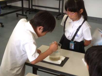 汚れた水の中に、硫酸バントを入れてかき混ぜると、水と混在物が見事に分かれていきます。実際に体験して、その不思議さに触れる体験学習をしています。