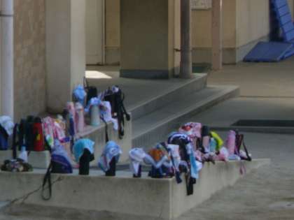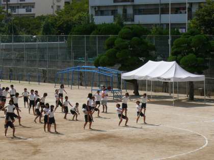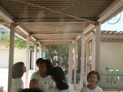 また、運動場の傍らに「ミストシャワー」を設置して、活用しています。その他、練習の合間に、冷房の使える教室を上手に活用しながら、運動会の練習が元気にできるように配慮しています。