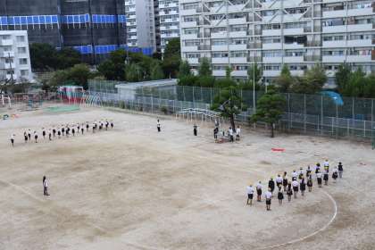 放課後に運動場を使って運動会の開閉会式の練習を行いました。