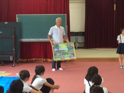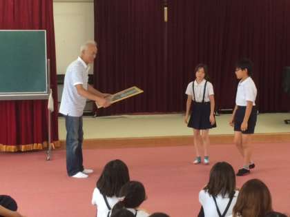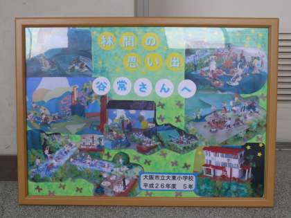 「贈呈式」です。昨年度、大東小学校では、秋に「作品展」を開催。「思いを伝えよう」というテーマで実施。昨年度の5年生が「林間学習」の思い出を、学年で立体作品に表現しました。その時に、お世話になったホテル「谷常」さんも再現していました。ということで、その作品を「写真パネル」にして、今年の林間学習での贈呈式へとゆだねたわけです。
