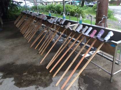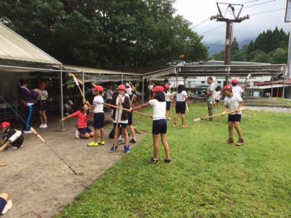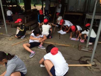 魚つかみも終わり、天候も回復したので、「たいまつづくり」に取り組みました。今年は一人1本のたいまつを持ってのキャンプファイヤーです。