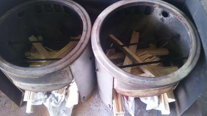 今回は、カレー用の鍋とご飯用の鍋の2つのコンロに火をおこします。新聞紙をうまく使って薪を組んでいきます。そして少しずつ火を大きくしていくわけです。