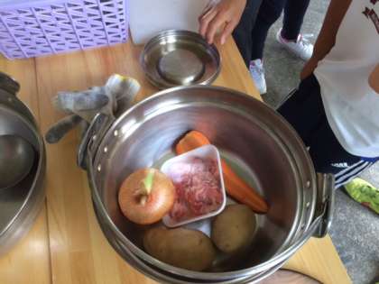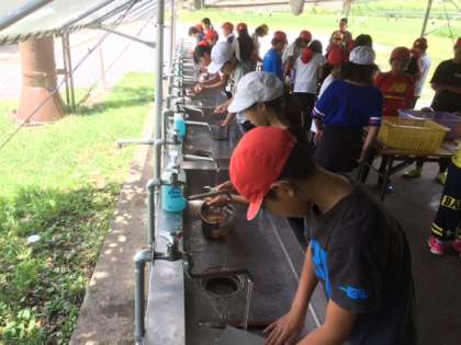 食材チームは、大切な食材を洗ったり切ったりします。慣れない野外で手を切らないように、家庭科の学習でした「猫の手」を思い出しながら、こだわりの切り方をします。(小さく切ったら火の通りがはやいのだけれど・・・)各担当者のこだわりの切り方で作業が進んでいきます。