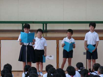 次に、2学期に向けて頑張りたいことを4年生の児童代表が発表しました。「みんなが楽しい学校生活が送れるように、代表委員会を頑張りたいです」「音楽を頑張りたいです。リコーダーを上手にふけるようになりたいです」「友だちにやさしくして、もっと仲よくなりたいです」「国語の漢字をしっかり覚えていきたいです」など、2学期の目標や頑張りたいことをしっかり発表しました。