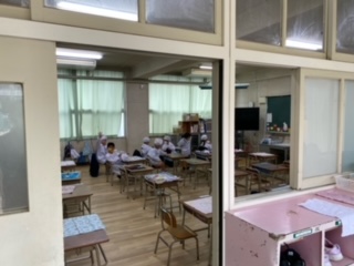 給食室へ 担任の先生と取りに行きます。待っている人は静かに自分の席で座っています。