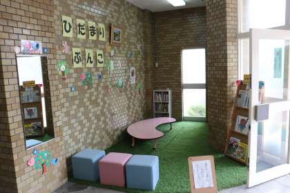 1階玄関内にあるひだまり文庫をリニューアルしました。長机やパイプ椅子の代わりに、一面に人工芝生を敷きつめました。
