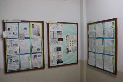 本校舎の1階と2階の踊り場には、1・2年生が生活科の掲示板、3〜6年生が総合的な学習の掲示板として、学習したことや調べたことなどを学年ごとに掲示しています。