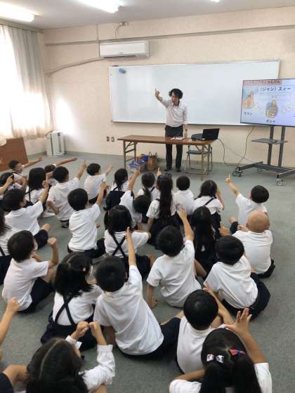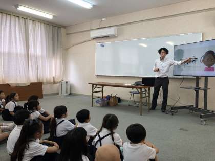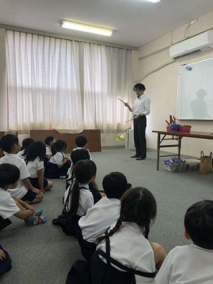 ゲストティーチャーをお招きして、いろいろな国のあいさつやじゃんけん、遊びなどを教えてもらいました。遊び方がそれぞれで、子どもたちは、「わたしもやりたい!」と興味をもって話を聞いていました。
