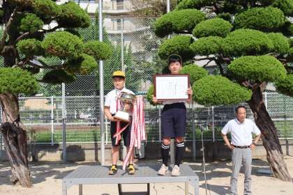 その中で校長先生から、先週の都島区子どもドッジボール大会優勝の男子メンバーの代表に表彰状と優勝トロフィーが授与されました。