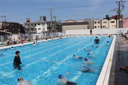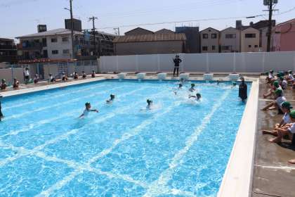 プール水泳で泳げるようになること。暑い夏のプール水泳を楽しむこと。も大切ですが、このように命を守るための学習も実施しています。