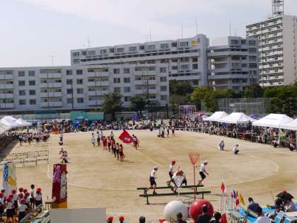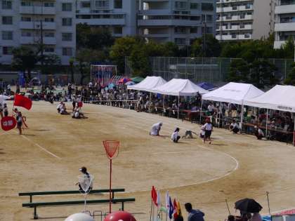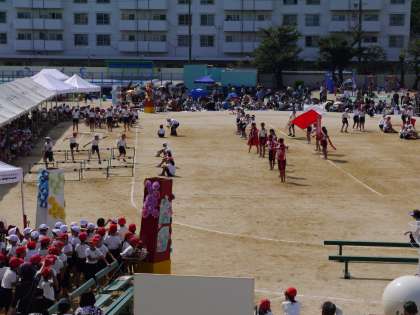 5年生による障害物競争です。ハードル、平均台、ネットくぐりと、たくさんの障害を乗り越えてゴールします。
