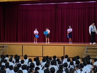 「二学期に頑張りたいこと」の発表を 四年生の3人のお友達が全校児童の前で発表しました。