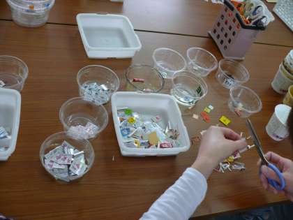 今日は、PTA厚生委員会とボランティアの皆さんでベルマーク整理がありました。たくさん集まったベルマークを1枚1枚切り取って、種類ごとに分けて整理します。