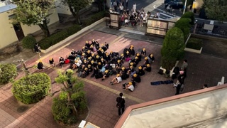 たくさんの保護者の皆さんに見守られながら玄関前にて出発式を行いました。