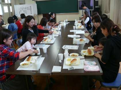 給食のレーズンパンを懐かしそうに食べる保護者の様子が印象的でした。