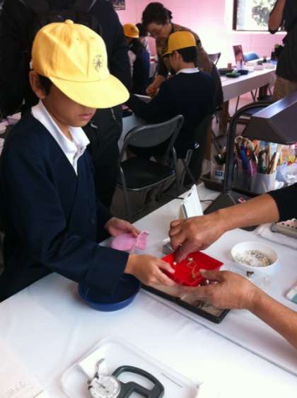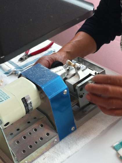 自分の大事な真珠を作業場に持っていき、真珠に穴をあけてもらいます。穴をあけるのもどこでもいいというわけではありません。その真珠が一番美しく見えるポイントを見つけて穴をあけます。そして、お気に入りのアクセサリー(ネックレス、携帯ストラップ)に専用の接着剤をつけて、はめ込みいざ完成。かわいい小袋に入れて、持って帰ります。