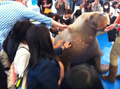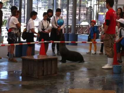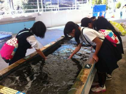 鳥羽水族館では、生き物を直に触って視覚だけでなく、触れ合うコーナーがあり、「キャッ、キャッ!」と楽しんでいました。