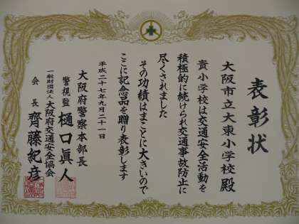 大東小学校が、交通安全活動を積極的に続けてきた功績をたたえて、大阪府警察から表彰状とたてが贈られました。