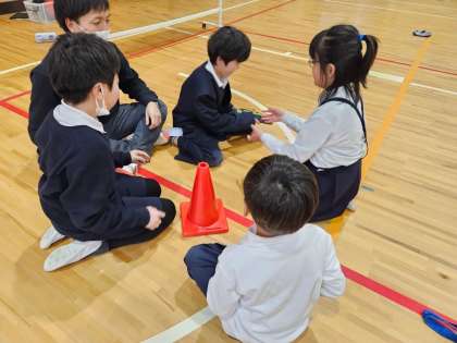 ドッチビーでは高学年の児童が低学年の児童に投げ方を教えたり、譲ったりしながら協力していました。