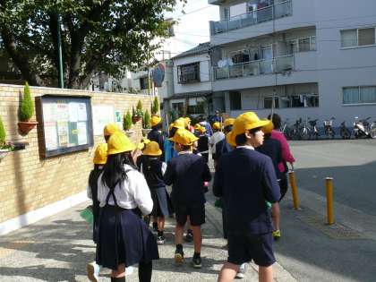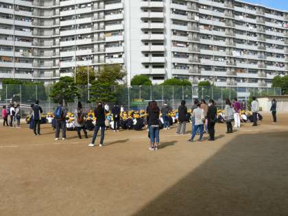 続いて、「地域清掃」縦割り班ごとに地域の公園や児童遊園に行って清掃をします。子どもたちが自分の地域の公園などを清掃する「社会貢献」「地域とのかかわり」を目的として実施しました。
