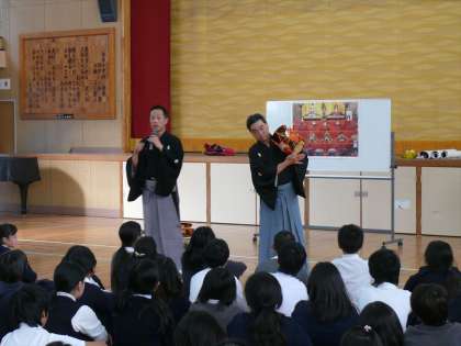 今日は、2月に行われる能楽鑑賞会に向けて、「大槻能楽堂」の皆さんに来ていただき、文化芸術体験ワークショップが行われ、5・6年生が参加しました。