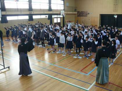 初めに、能についてのお話をうかがい、校歌にフシをつけ謡にアレンジしたものを体験しました。高い音や低い音が出せる「鼓」に感心し、校歌の「謡」のむずかしいフシにも講師の先生に教えてもらいながら、しっかり歌うことができました。