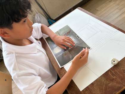 教室や廊下、体育館などそれぞれ写真を撮りに行って、それを見ながら丁寧にかいています。