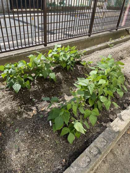 5月中旬にインゲンマメの苗を植え、ヘチマのたね(5年生は種子と呼びます)をまきました。毎日、各クラスの植物係・生物(いきもの)係が水やりをしているおかげで大きく育っています。