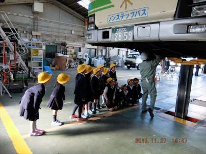 そして、車庫では3つのグループに分かれて見学しました。事務所の中での仕事や大型ジャッキでバスを持ち上げ、バスの下の様子やエンジンの中を説明してもらいました。また、バスに乗りこみ、大型洗車機でバスが洗われていく様子や車いすでの乗車の仕方を見学しました。