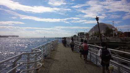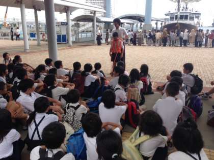 南京町を抜けて、メリケンパークにつきました。神戸港を海から見学するために、クルーザーに乗り込み前の救命胴着の着脱方法の説明を受けています。