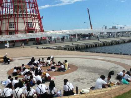神戸ポートタワー前で昼食中です。昼食後も、学習・見学は続きます。