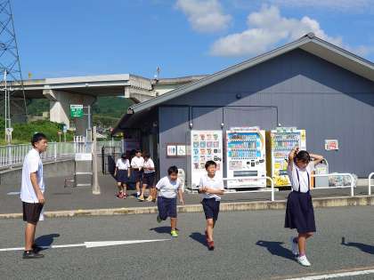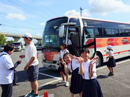 渋滞にかかり少し遅れていますが順調です。子どもたちもみんな元気で、バスレクで盛り上がつています。