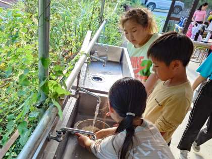 材料カットやお米研ぎ、火起こしなど、グループで仕事を分担して進めます。