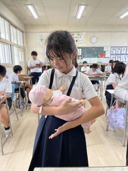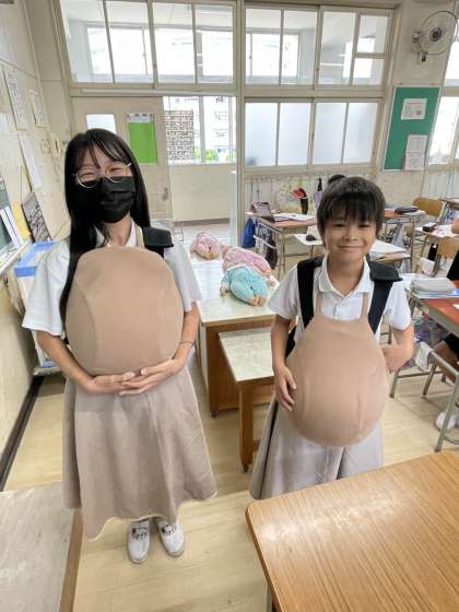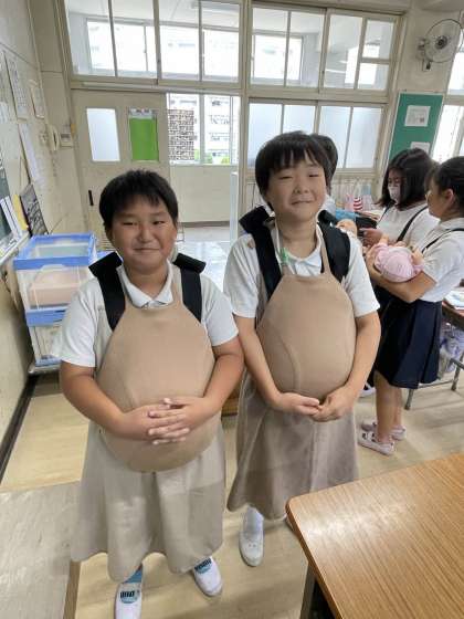 今日は妊婦体験をしたり、新生児の人形をだっこしたりして命の重さを知ることができました。子ども達は、「お母さん大変やな。」「すごく重い思いをしてたんやな。」「お母さんが産んでくれたことに感謝やわ。」など思い思いに感想を言っていました。