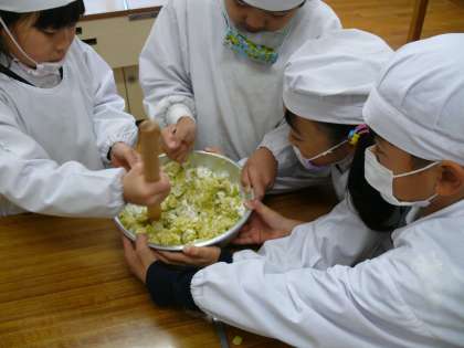 ゆでたサツマイモの皮をむき、つぶします。つぶした芋と砂糖や片栗粉をていねいに混ぜ合わせます。順番にかき混ぜ役が回ってくるのですが、なぜか全員が「おいしくなーれ!おいしくなーれ!」とおいもに話しかけながら混ぜていました。