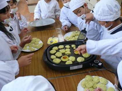 先生から「いい」と言ったのではなく、だれかが言った一言に学年の全員が乗っかって、みんなが話しかけながら混ぜる光景が、驚きながらもほのぼのとした雰囲気での調理活動でした。ボールを押さえるのに力のない子には、周りの子が支えてぐるぐると安心して、混ぜていました。
