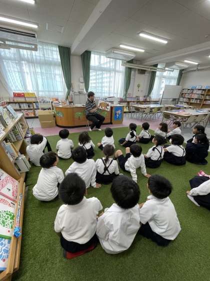 今日は、図書の時間にC-Netのジョエル先生が読み聞かせをしてくださいました。