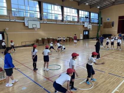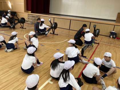 ボートをこぐための練習用マシーンを使って体全体を動かす活動をしたり、ボールを使った楽しいゲームをしたりして、子ども達は声をかけ合い、協力しながら高校生の人達ととても楽しい時間を過ごしました。