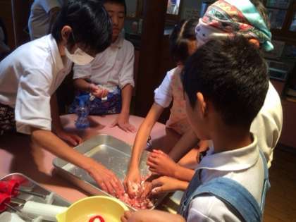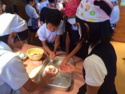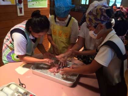 豚肉に片栗粉などをまぜて練りこんでいきます。粘りがでるまで練りこみます。