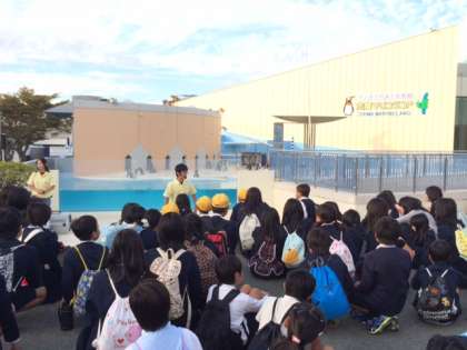 約2時間の移動を終えて、志摩に到着しました。「志摩マリンランド」は、マンボウで有名な水族館ですが、児童は、海の生き物のタッチや餌やりを体験します。